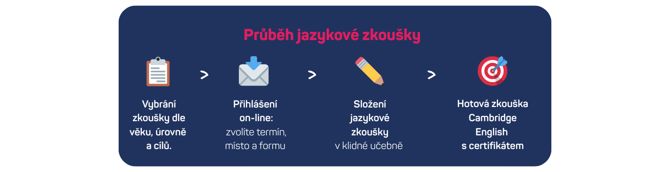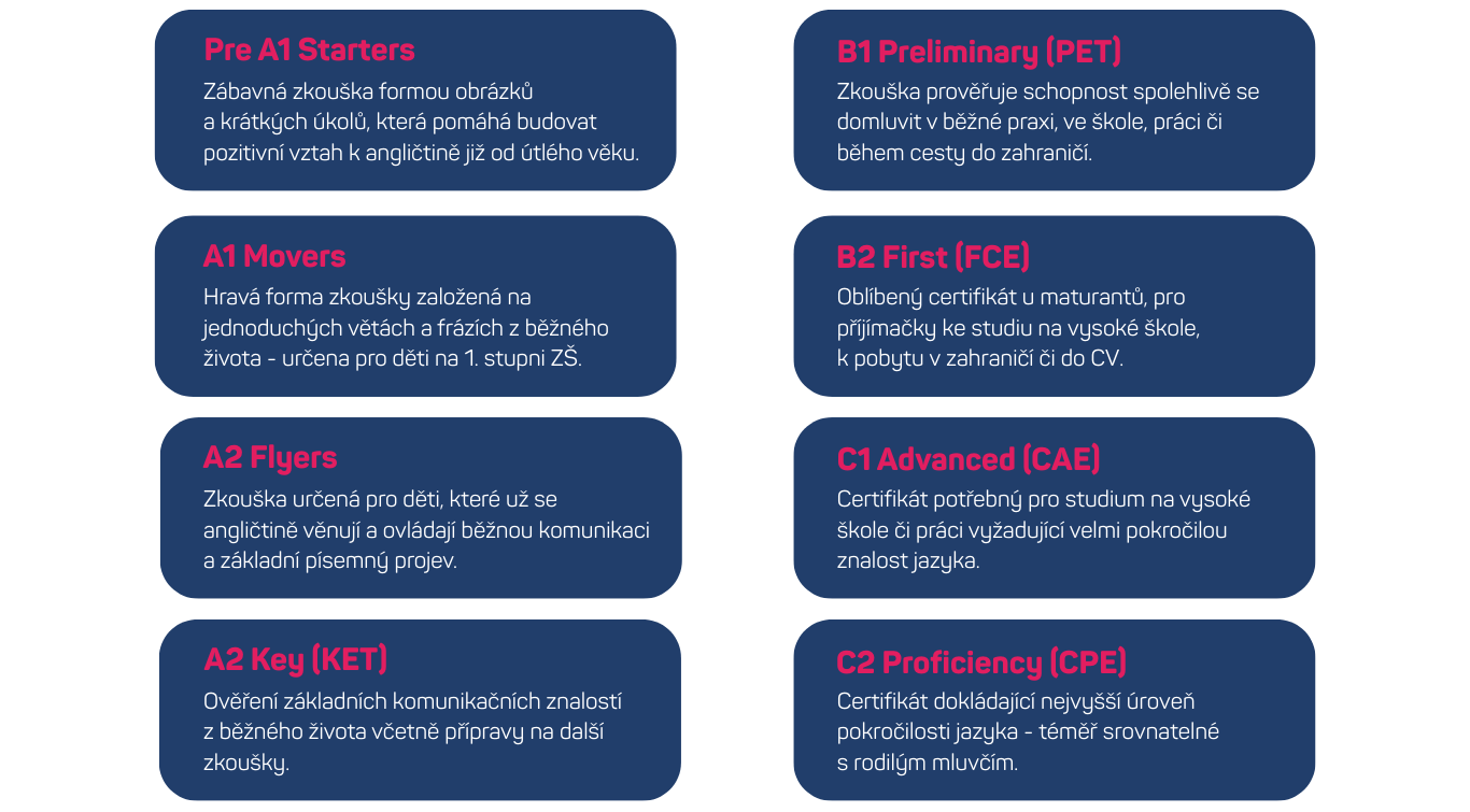 Absolvování kurzu u nás není podmínkou k absolvování zkoušky. Poskytujeme ovšem přípravu před zkouškou, a to u nás v jazykovce / samostatně / v rámci školy, která vám může s přípravou výrazně pomoci.