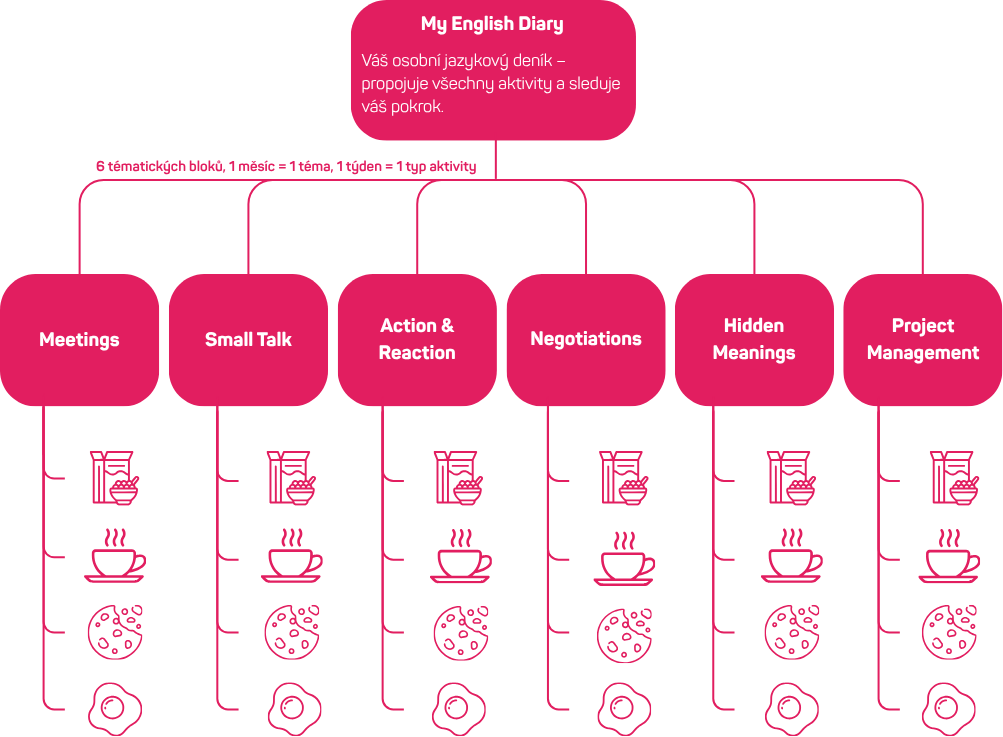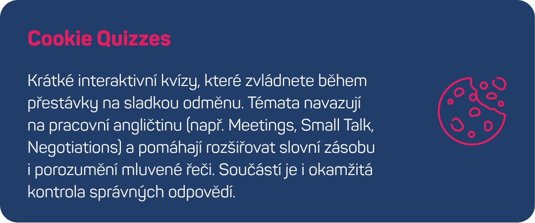 Krátké aktivity přinášejí novou slovní zásobu a fráze v pracovním kontextu. Mozek tak informace snadno vstřebá a propojí s tím, co už znáte.