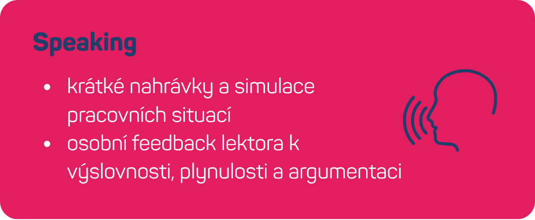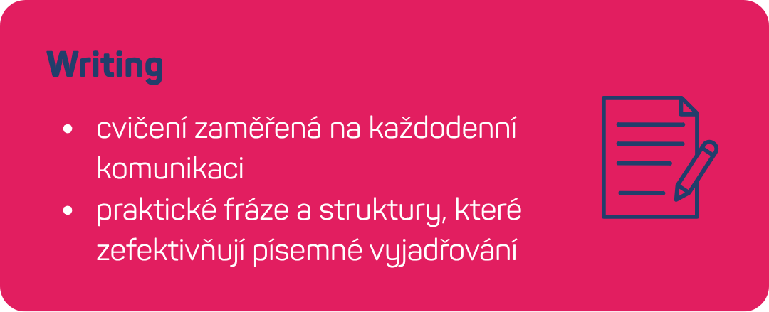 • Produktivní dovednosti (speaking a writing) naopak posilují schopnost jazyk aktivně používat – formulovat myšlenky přesně, plynule a s jistotou.