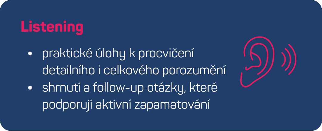 Úkoly vás vedou k aktivnímu používání jazyka – mluvení, psaní i reakci v kontextu. Každé zopakování pomáhá rychleji si vybavit správná slova, když je potřebujete.